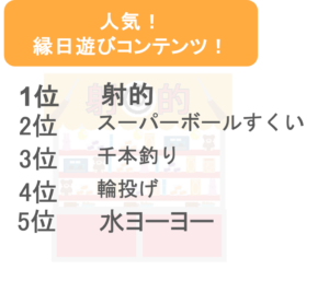 • 射的、輪投げ、スーパーボールすくいなど、定番のゲームは集客力抜群。